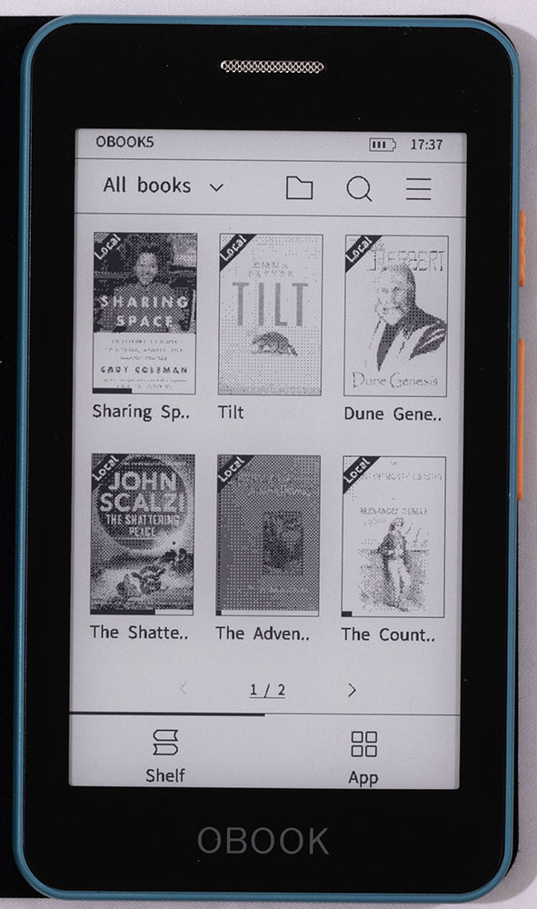 The OBook is a very complete, polished device. It can read all of the major ebook formats including Epub, mobi, and AZW3 as well as txt, RTF, HTML and Microsoft Word documents. Book files can be transferred over USB using the built-in Transfer app. When launched, the Transfer app mounts the OBook on the Mac’s desktop, allowing for drag-and-drop book installation (I haven’t tried it with Windows). Note that, every time I’ve done this, the Mac has shown a completed progress bar and then declared the copy a failure. If I ignore these warnings and follow up the copy operation with the OBook’s Import Book command, the book ends up in the device’s library with no problem.