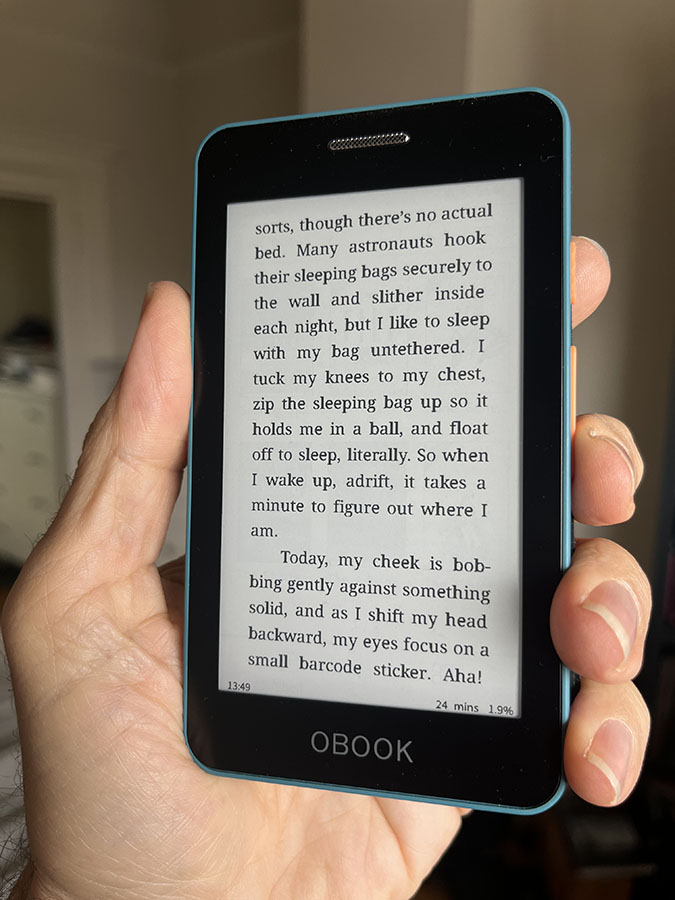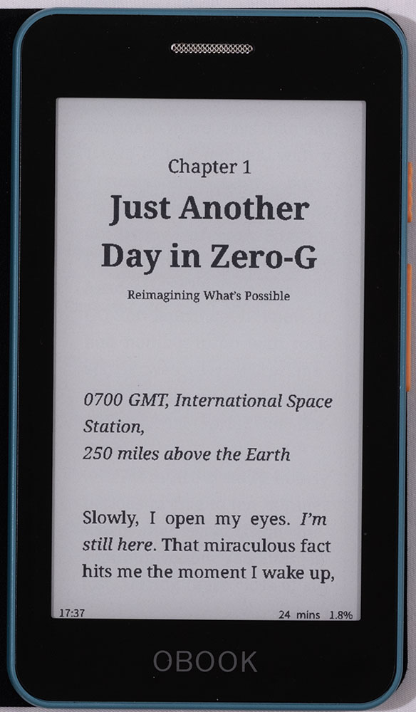The screen offers excellent contrast while the sidelight is bright and provides 20 levels of adjustment. There’s no warmth control, but my Kindle doesn’t have one either, so it’s not a feature I’m used to. Like the Kindle, I find that I rarely need more than a few notches of screen brightness, which means I get great battery life. I haven’t run it to empty, but the OBook has lasted for weeks so far.