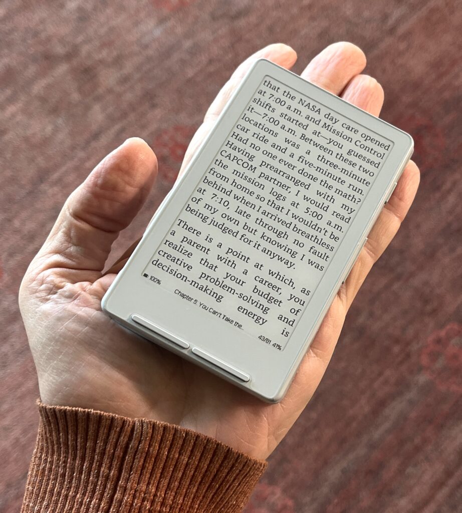 That’s the Xteink X4 which does nothing but act as an e-reader, and a very stripped down one, at that. No light, no touchscreen, and only $70. It’s smaller than my mini iPhone – and much smaller than a Boox Palma – so it will fit in any shirt pocket and certainly in any jacket pocket. For the last few weeks I’ve been trying out both the Xteink X4 and the OBook 5. They each have their advantages and disadvantages, but what they’ve got in common is that they both have demonstrated to me that I really enjoy having a second reader of this size.